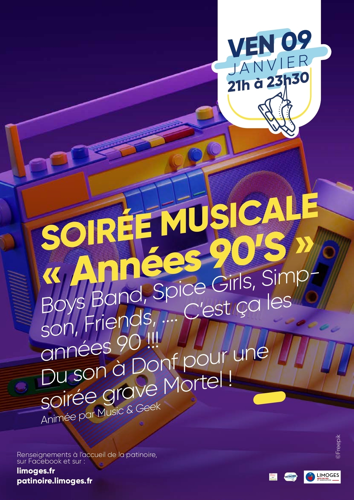 Rendez-vous dans votre Patinoire de Limoges, le vendredi 09 janvier 2026 à partir de 21h pour une Soirée Années 90'S, animée par Music and Geek
