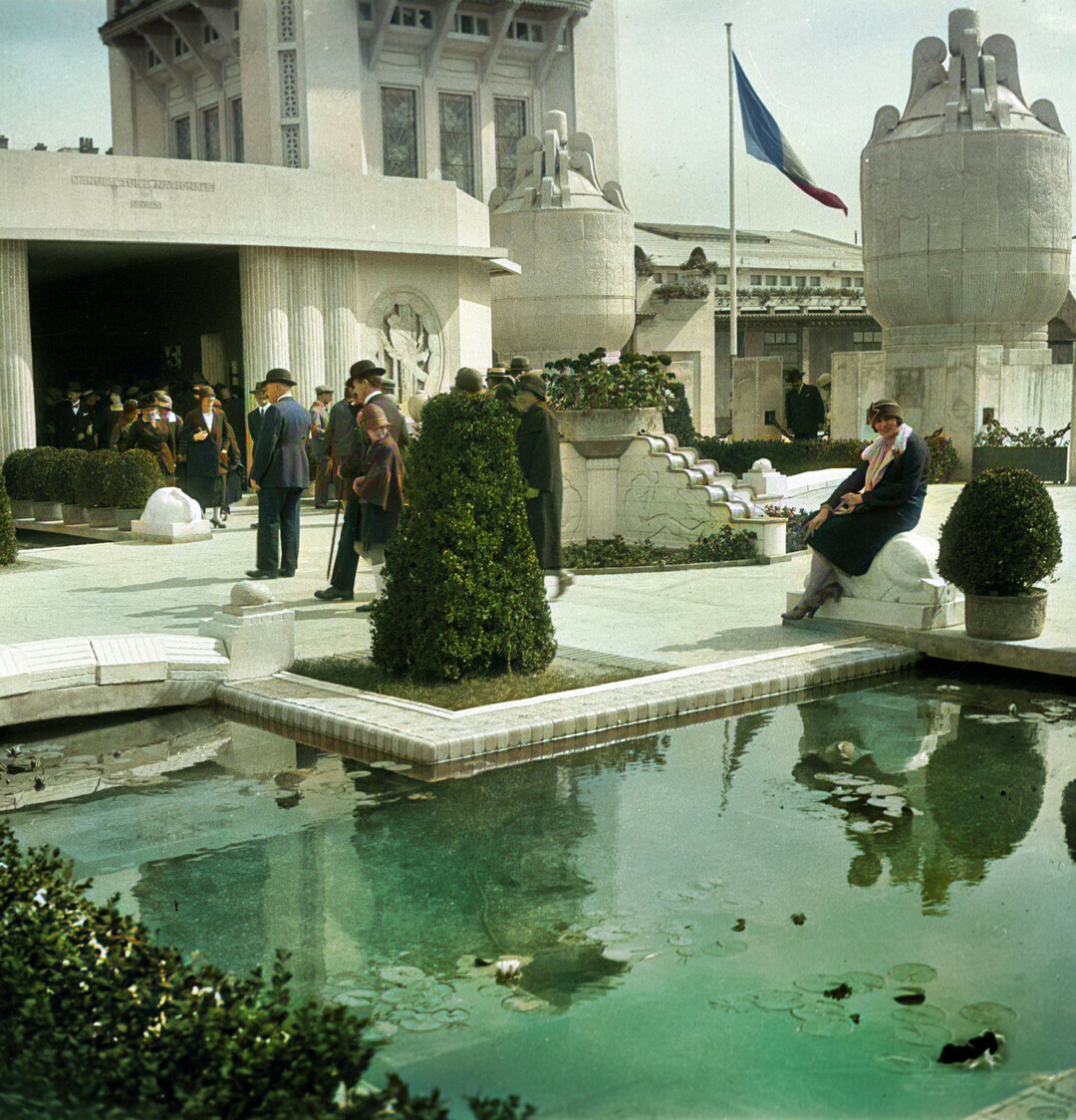 Plaque photographique amateur 6x6 colorisée en Hdef (Coll. Pers.). Esplanade des Invalides : Pavillon et Vases de la Manufacture nationale de Sèvres, par Pierre Patout. Jardins du pavillon par Henri Rapin, fontaine par Henri Bouchard.