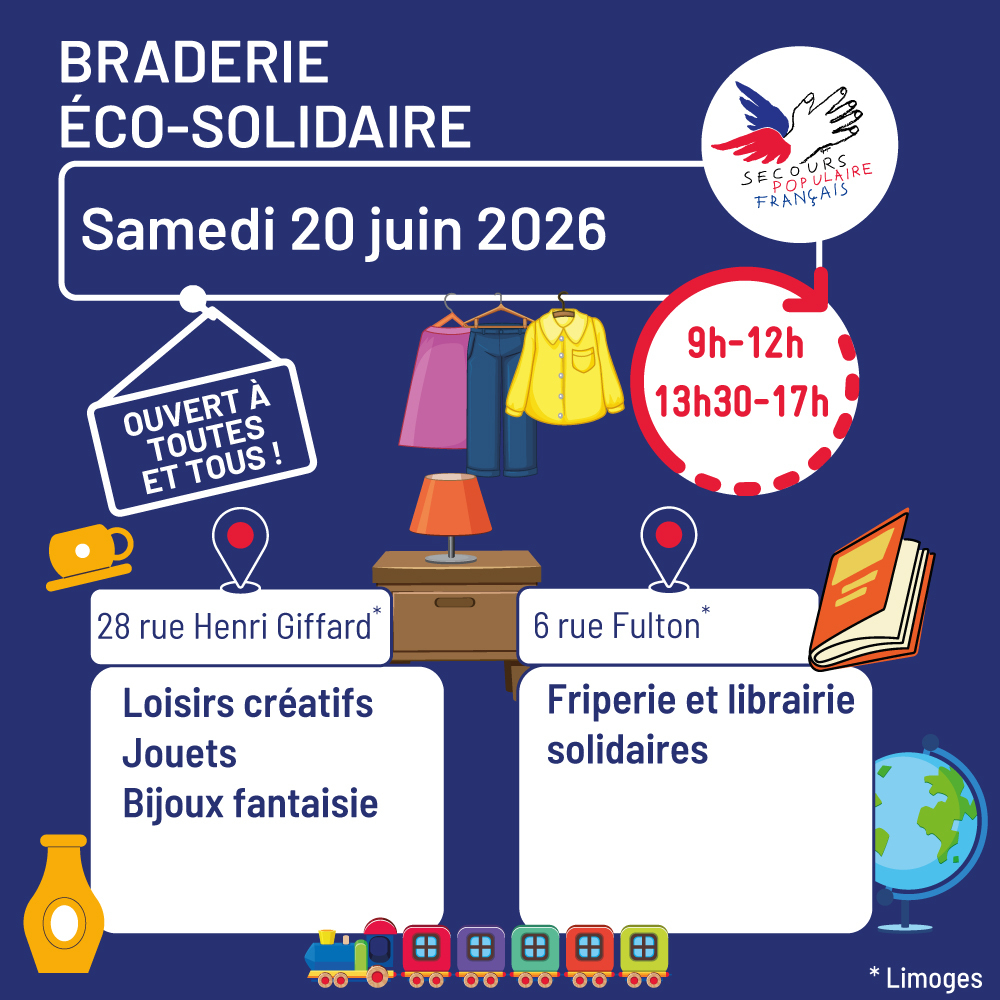 Les espaces de vente du Secours Populaire en Zone Nord à Limoges seront ouverts le samedi 20 juin 2026 de 9h00 à 12h00 et de 13h30 à 17h00.