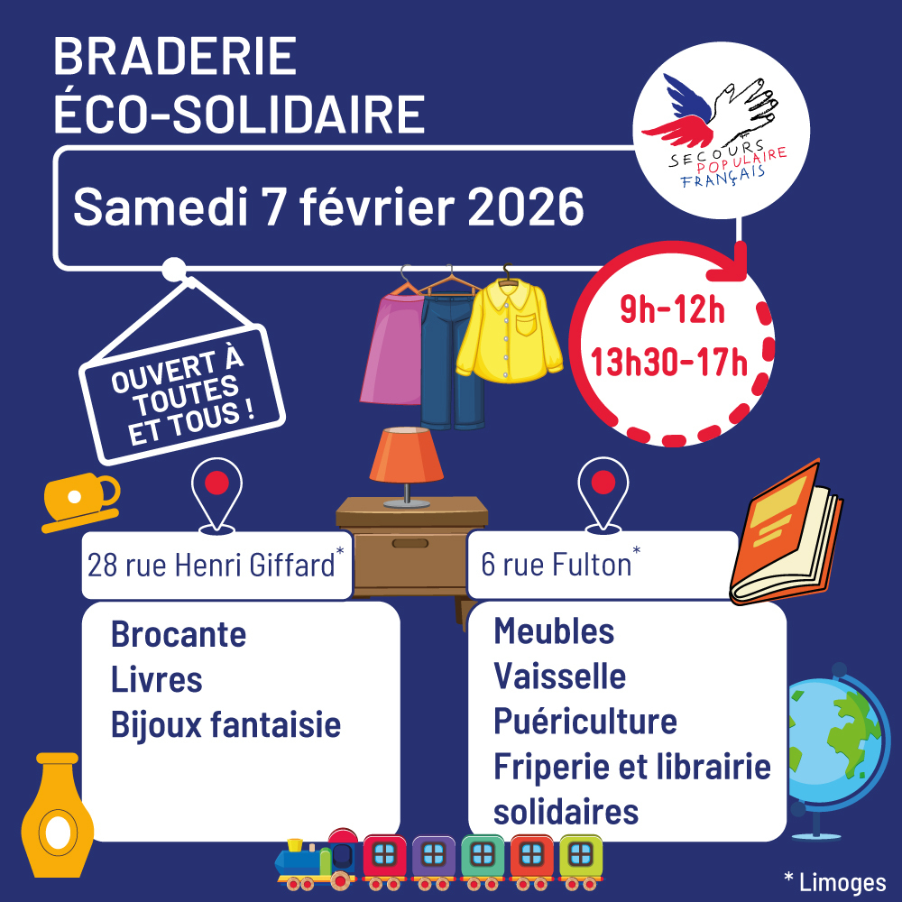 Les espaces de vente du Secours Populaire en Zone Nord à Limoges seront ouverts le samedi 7 février 2026 de 9h00 à 12h00 et de 13h30 à 17h00.