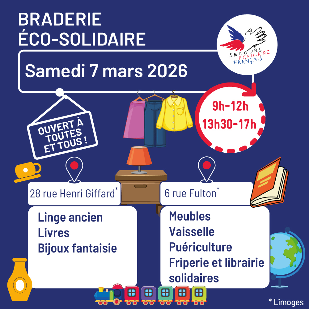 Les espaces de vente du Secours Populaire en Zone Nord à Limoges seront ouverts le samedi 7 mars 2026 de 9h00 à 12h00 et de 13h30 à 17h00.