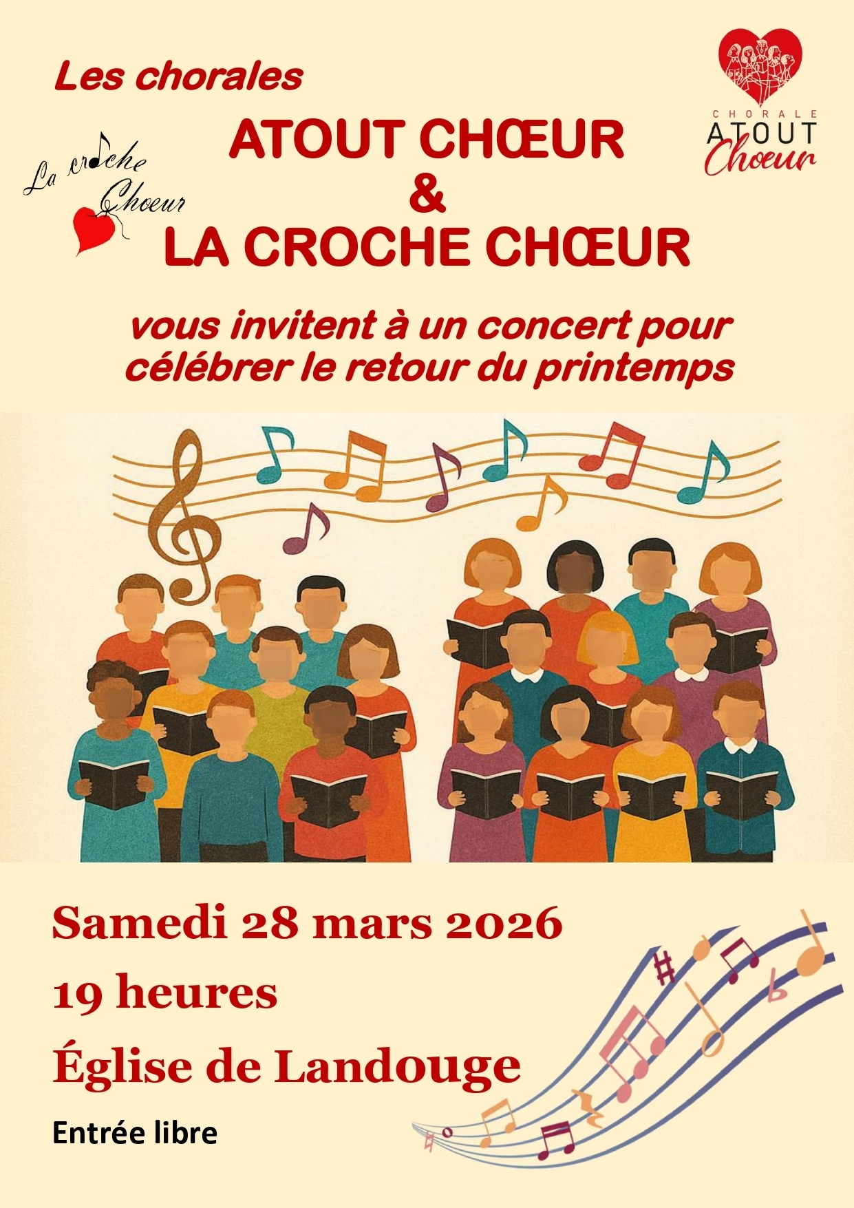 Pour célébrer le retour du printemps la chorale Atout Chœur a invité la chorale La Croche Chœur de Saint Brice pour un concert en commun le samedi 28 mars à 19 h en l’église de Landouge. Ces deux ensembles, ont un programme éclectique allant de Mozart à Goldman en passant par Bortniansky et Lara Fabian. Les choristes vous feront voyager avec Lord I want, un célèbre negro spiritual, ou Balaio, chanson populaire brésilienne…en bref un programme pour tous les goûts musicaux. La chorale La Croche Chœur dirigée par Isabelle Barbot comprend 38 choristes répartis en quatre voix, la chorale Atout Chœur compte 58 membres sur quatre pupitres ; elle est dirigée par Bénédicte Chevalier.