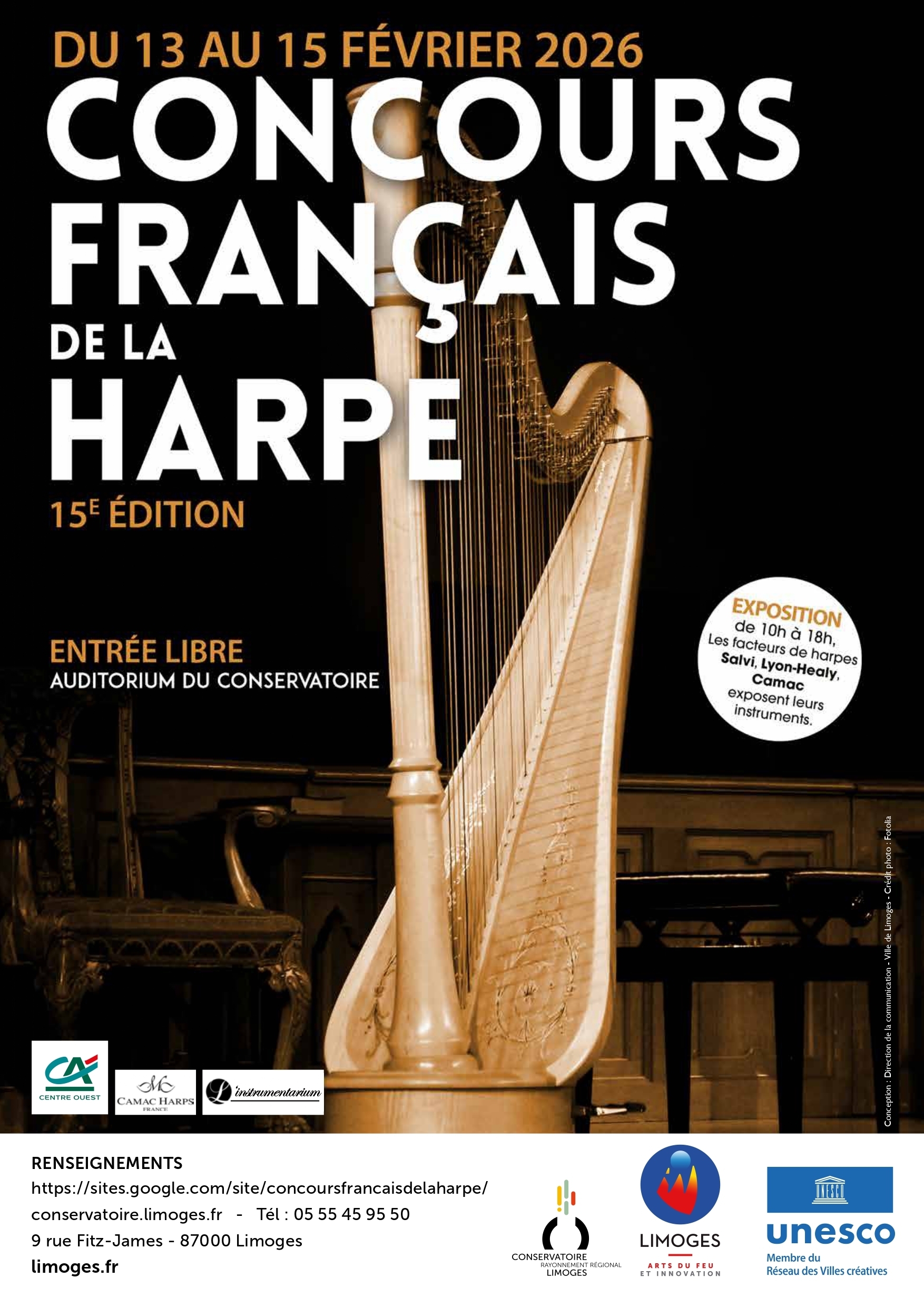 Du 13 au 15 février, la Ville de Limoges et son Conservatoire, en partenariat avec l’association Concours français de la harpe, organisent la 15e édition du Concours français de la harpe.