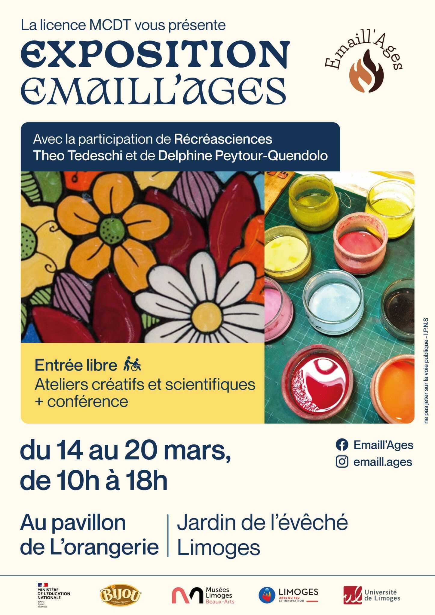 Le projet Emaill'Ages se propose de faire découvrir l’émail d’art sur métal, ses techniques, son patrimoine artistique, son histoire, ses acteurs locaux à un public d’enfants. Il aboutira à une exposition ouverte à tous du 14 au 20 mars 2026 au pavillon de l’Orangerie/10h-18h. Durant cette semaine le public pourra découvrir les créations des enfants et des émailleurs partenaires, participer à un atelier de création et un atelier scientifique, assister à une conférence.