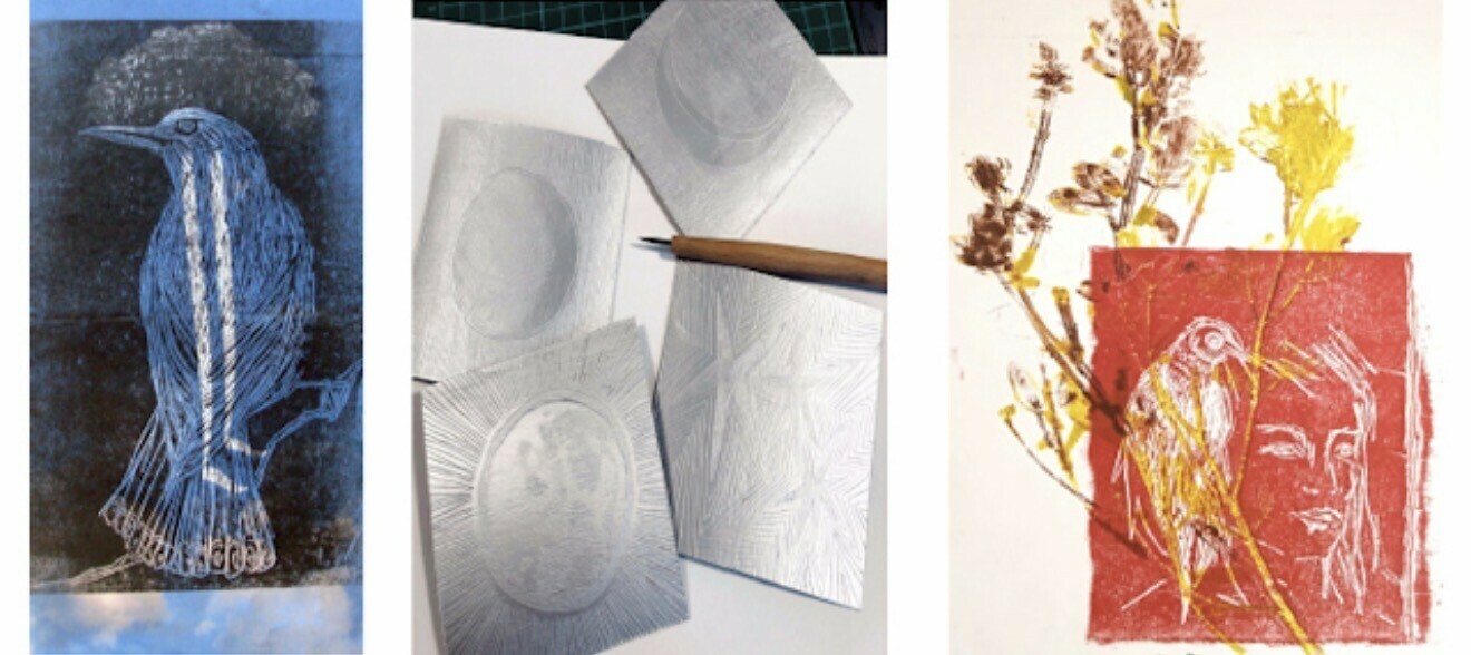 Présentation des diverses techniques de gravure pour ensuite expérimenter le plaisir de la gravure sur tetrapak et polystyrène, sur papiers de récupération et avec des éléments de la nature.