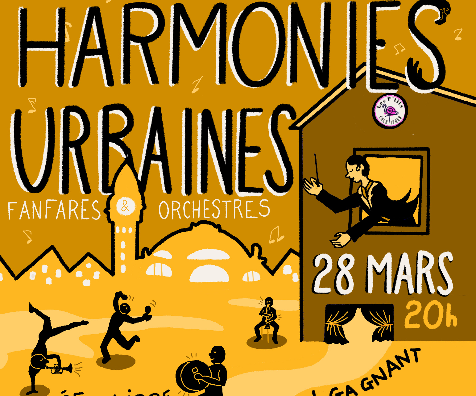 Créé par l’ensemble local les P’tits Culs Ivres, Harmonies urbaines, c’est le mélange des genres autour d’une orchestration commune. Pour cette première édition, après des animations dans le centre-ville de Limoges en journée, retrouvez orchestres d’harmonies et fanfares de rue, d’ici et d’ailleurs, partageant la même scène pour un moment musical inédit, intense et surprenant !"