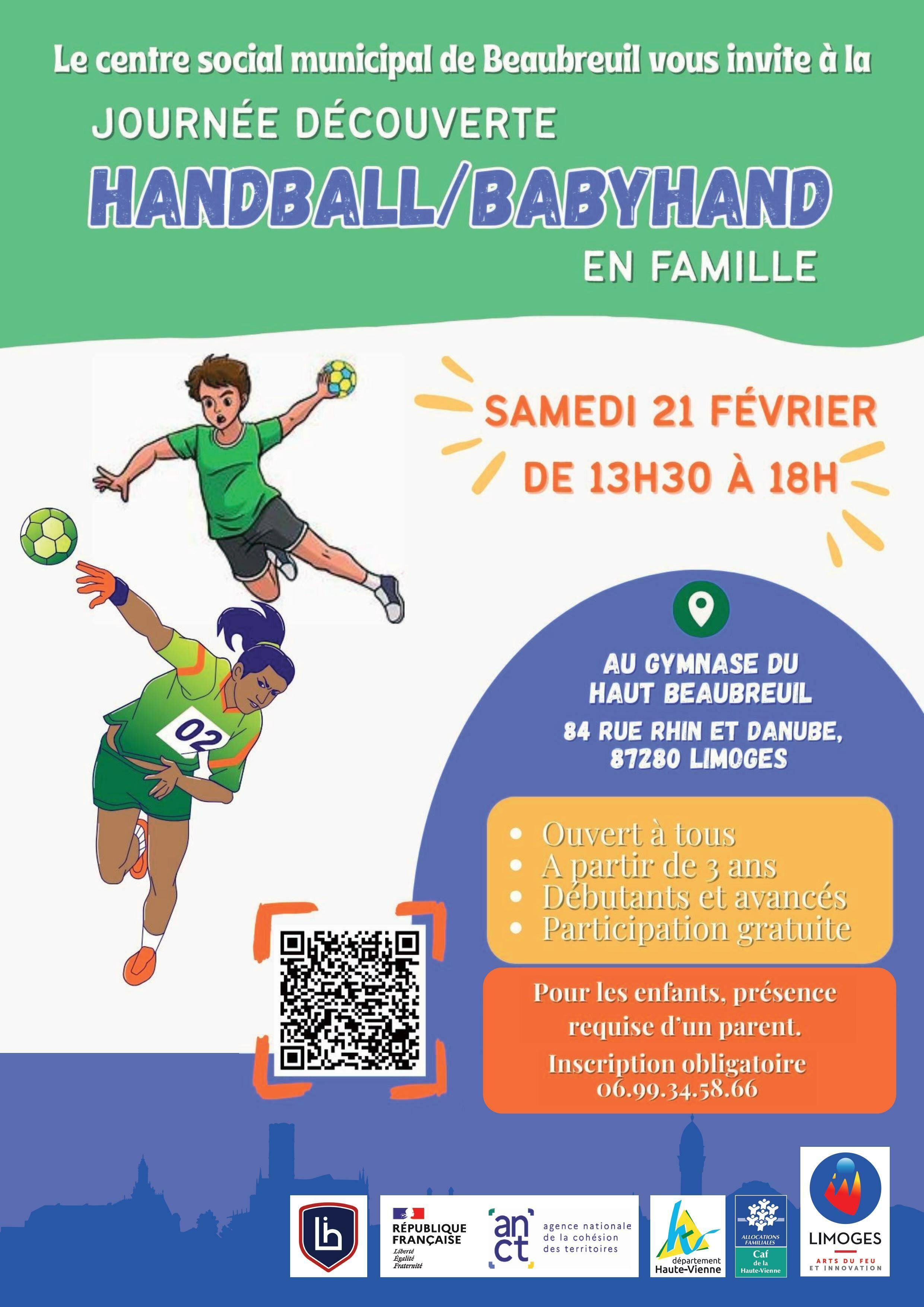 Le Centre social municipal de Beaubreuil en partenariat avec le Limoges Handball vous invite à une journée sportive, ludique et conviviale autour du handball et du babyhand, ouverte à toute la famille. Cet événement se déroulera le samedi 21 février, de 13h30 à 18h, au gymnase du Haut Beaubreuil, 84 rue Rhin et Danube, 87280 Limoges.