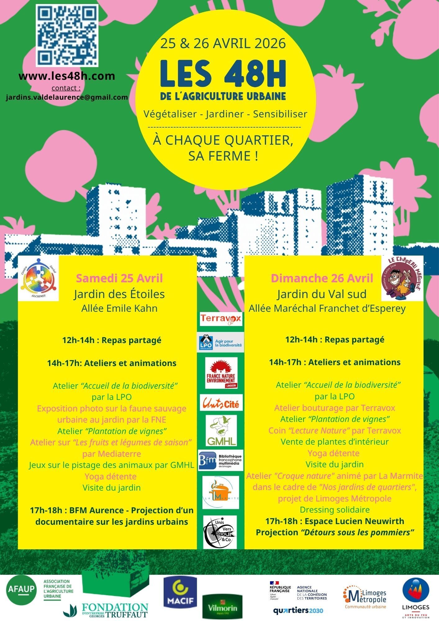 Dans le cadre de l'évènement national "48h de l'agriculture urbaine", organisé par l'AFAUP et avec le soutien de la Fondation Truffaut, les centres sociaux, Le Chapeau Magique et Alchimis, proposent les 25 et 26 avril prochains en partenariat avec de nombreux acteurs un programme d'animation afin de valoriser les dynamiques des jardins participatifs du Val de l'Aurence. Le jardin des étoiles et le jardin du Val Sud sont des espaces de proximité au service du vivre-ensemble et d'activités de sensibilisation aux enjeux de l'environnement.