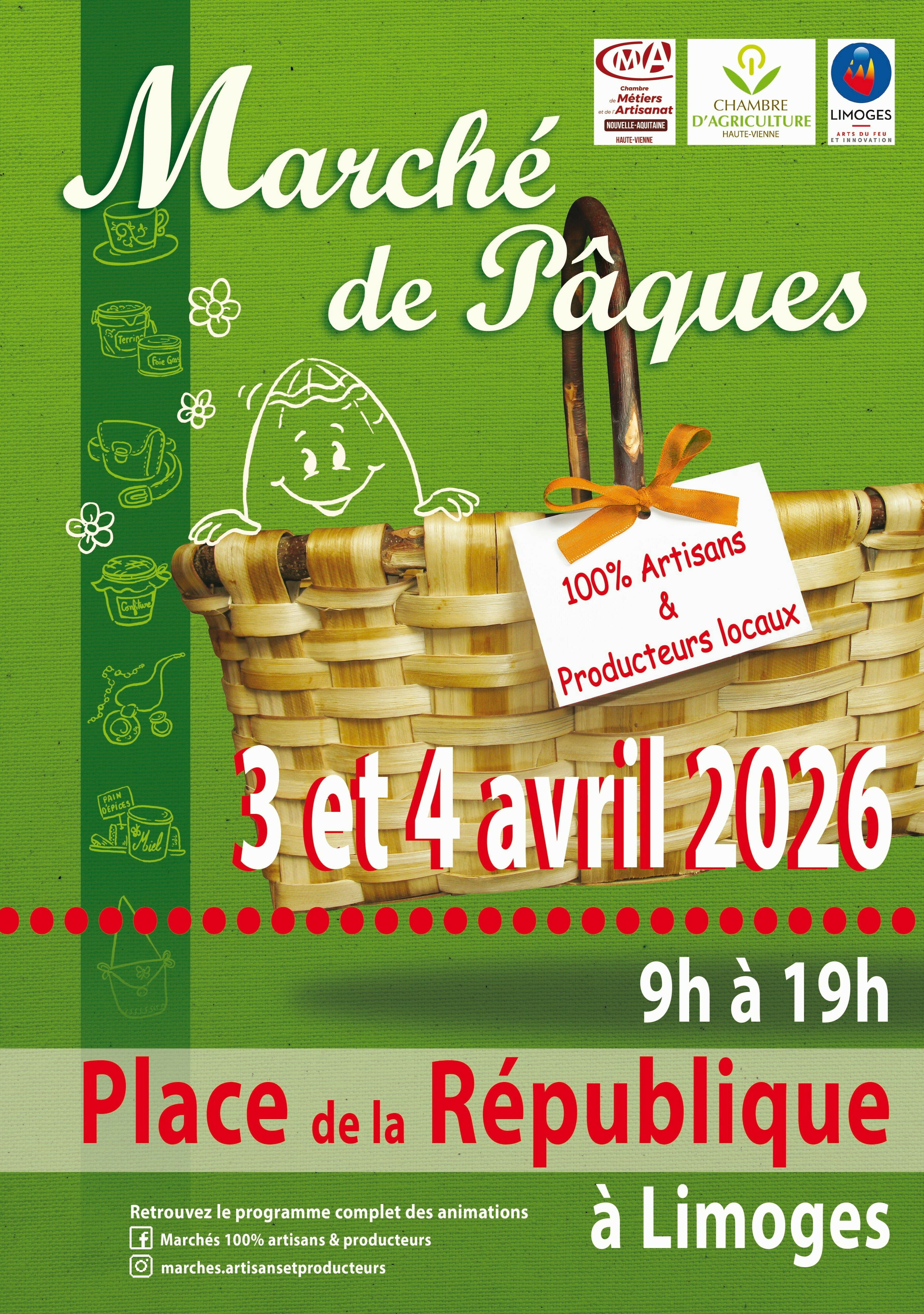 La Chambre de Métiers et de l’Artisanat et la Chambre d’Agriculture de la Haute-Vienne, en partenariat avec la Ville de Limoges, organisent le 24ème Marché de Pâques.