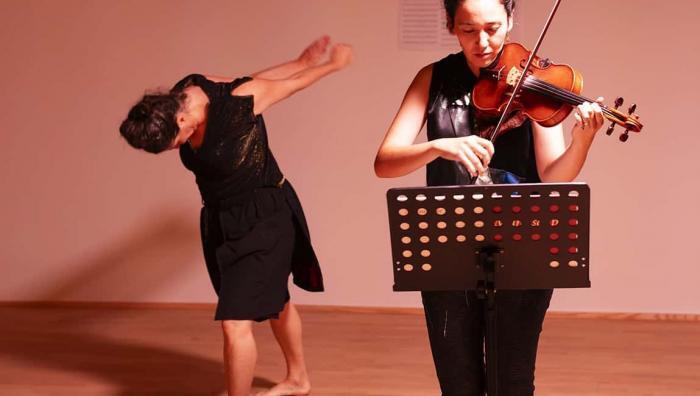 De la mixité des disciplines naît une danse fédératrice, comme un partage complice qui explore toutes les vibrations sensibles de l’espace. Le jeu d’archet sur les cordes se remplit de gestes obsessionnels qui font écho aux mouvements de Claire. La musique d’Aisha, qui aborde le répertoire ancien du XVIIe siècle tout comme l’interprétation audacieuse de la musique contemporaine, devient véritable force physique qui affecte le corps de la danseuse, jusqu’à inviter aux chants.