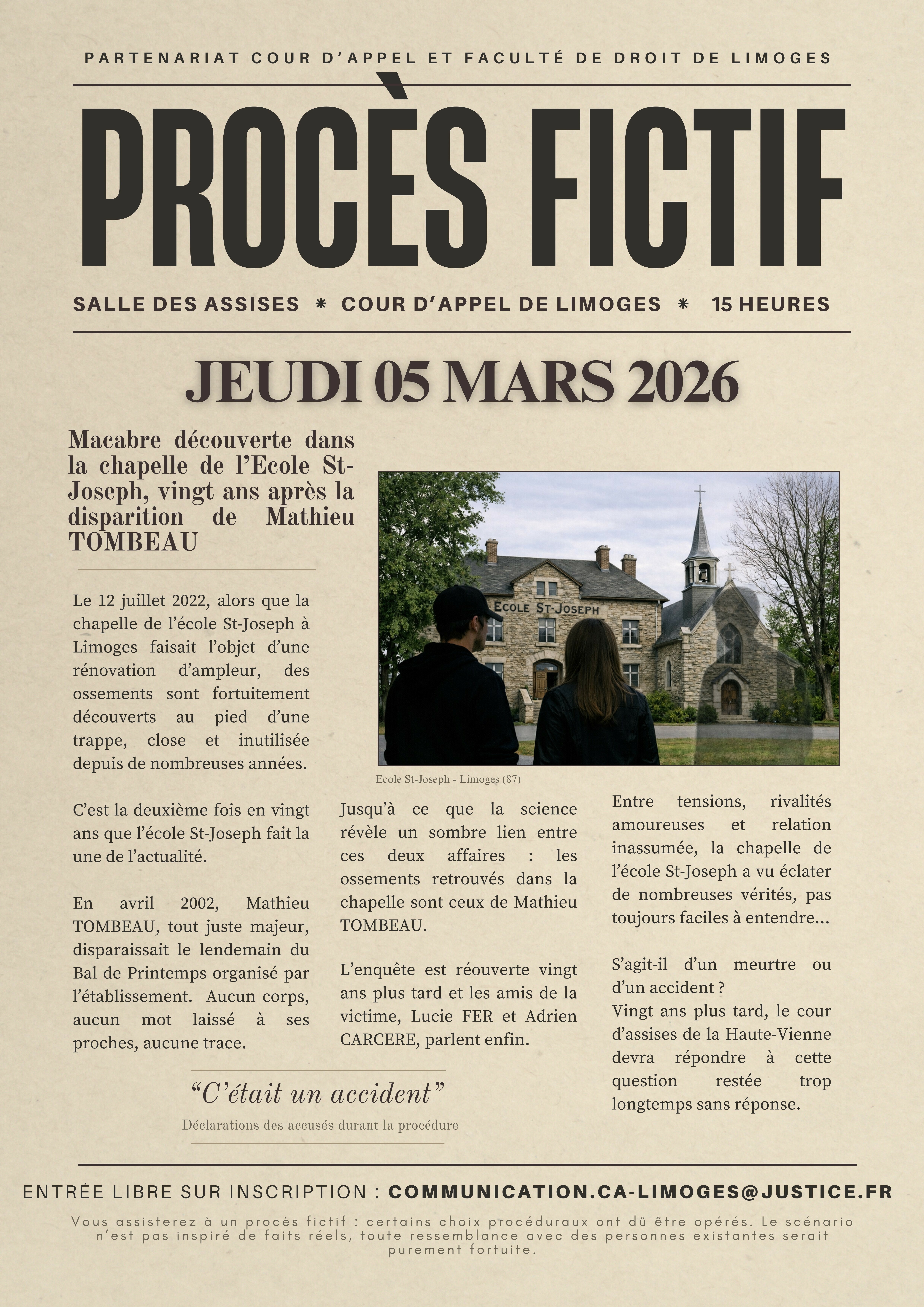 Un procès fictif en présence des étudiants des Masters 2 Droit pénal international et européen et Droit privé et droit européen des droits de l'homme aura lieu dans la salle des assises de la cour d'appel de Limoges, le 05 mars 2026, à 15h.