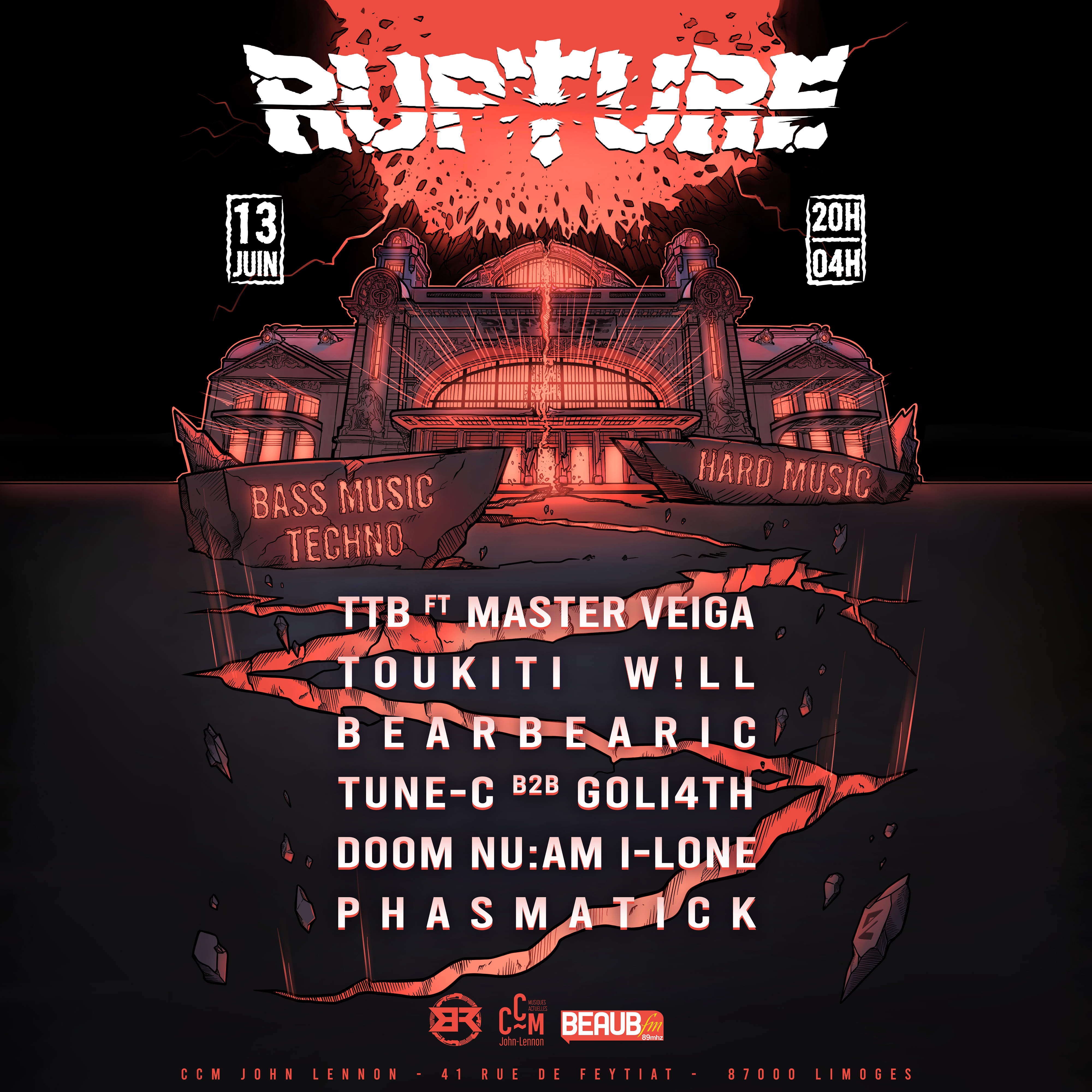 Le collectif Bordelais Bass Reload fête ses 10 ans et décide de poser une nouvelle fois ses platines à Limoges pour l'occasion ! Après 3 soirées "Blast" mémorables au Zic Zinc (paix à son âme), c'est le CCM John-Lennon qui a été choisi pour passer la vitesse supérieure et faire vibrer Limoges pendant près de 8h. "RUPTURE" ?? Parce qu'on casse les codes pour proposer une soirée complètement éclectique qui allie Bass Music, Techno et Hard music: de quoi fissurer le sol Limougeaud à grands coups de basses énervées et de kicks brutaux...