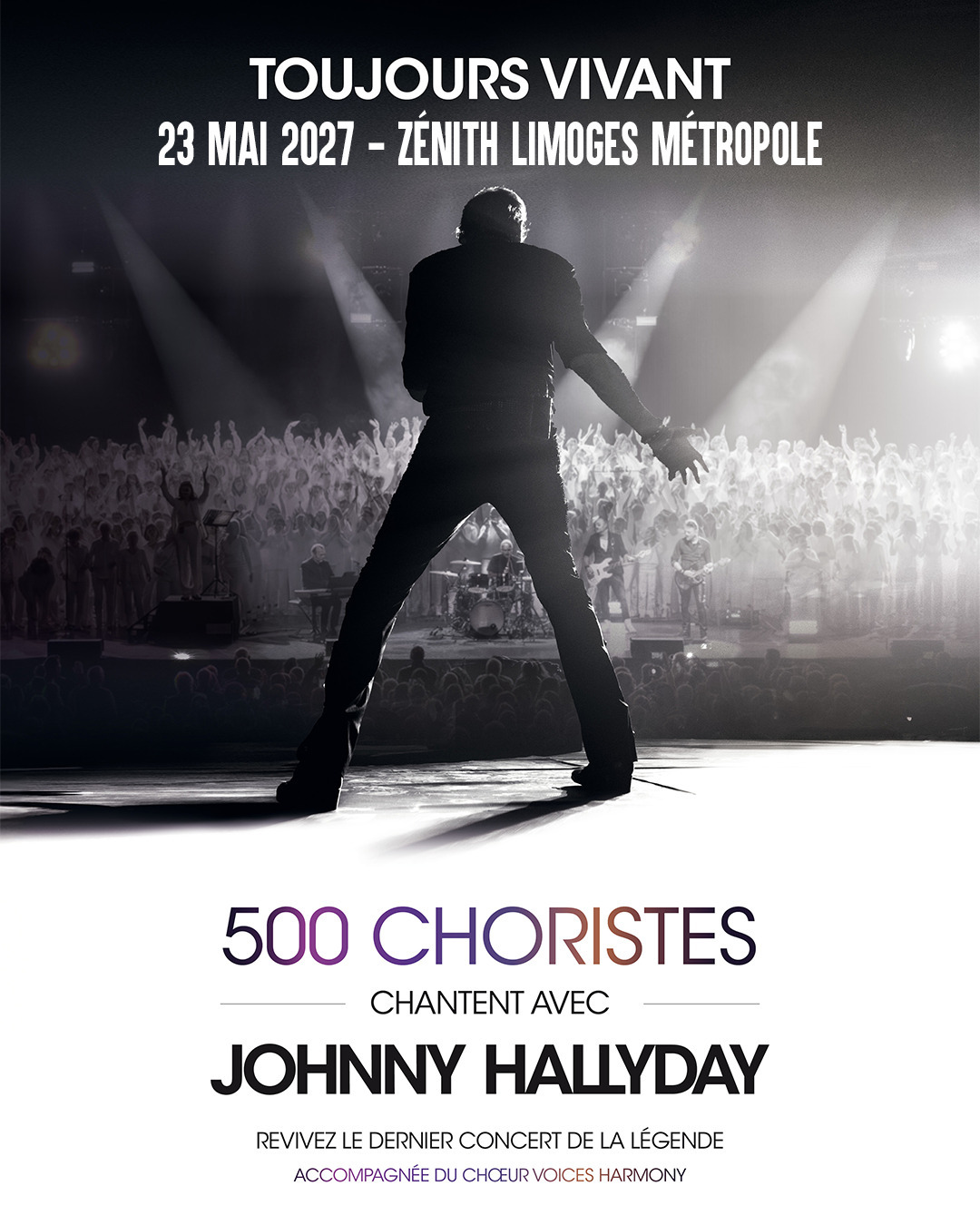 Et autour de lui, 500 voix du chœur Voices Harmony s’élèvent, des musiciens live vibrent, pour l’accompagner dans la même énergie d’un ultime concert.