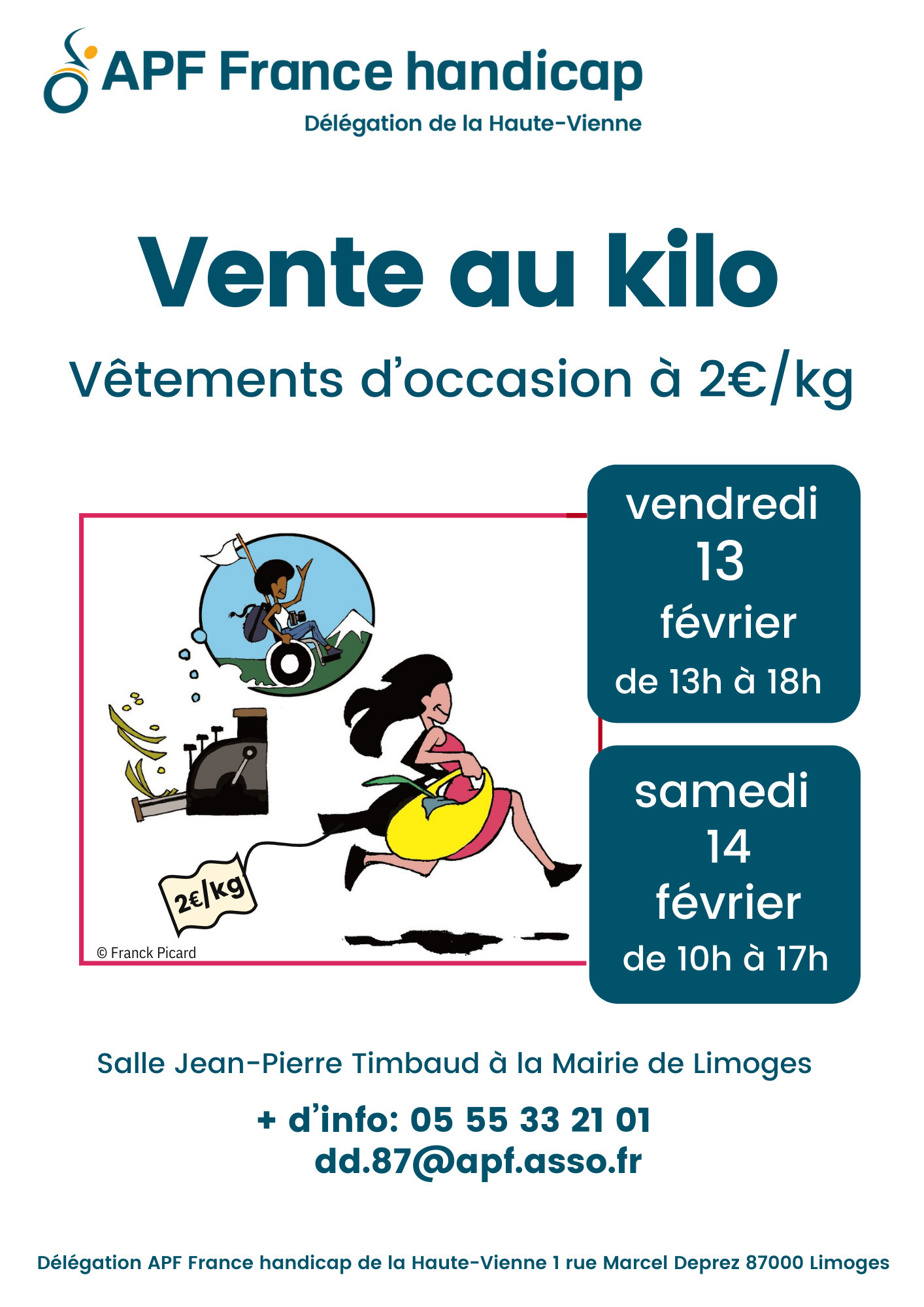 Le vendredi 13 février 2026 de 13h à 18h et le samedi 14 février 2026 de 10h à 17h, la Friperie d'APF France handicap organise une Vente au Kilo de vêtements d'occasion.